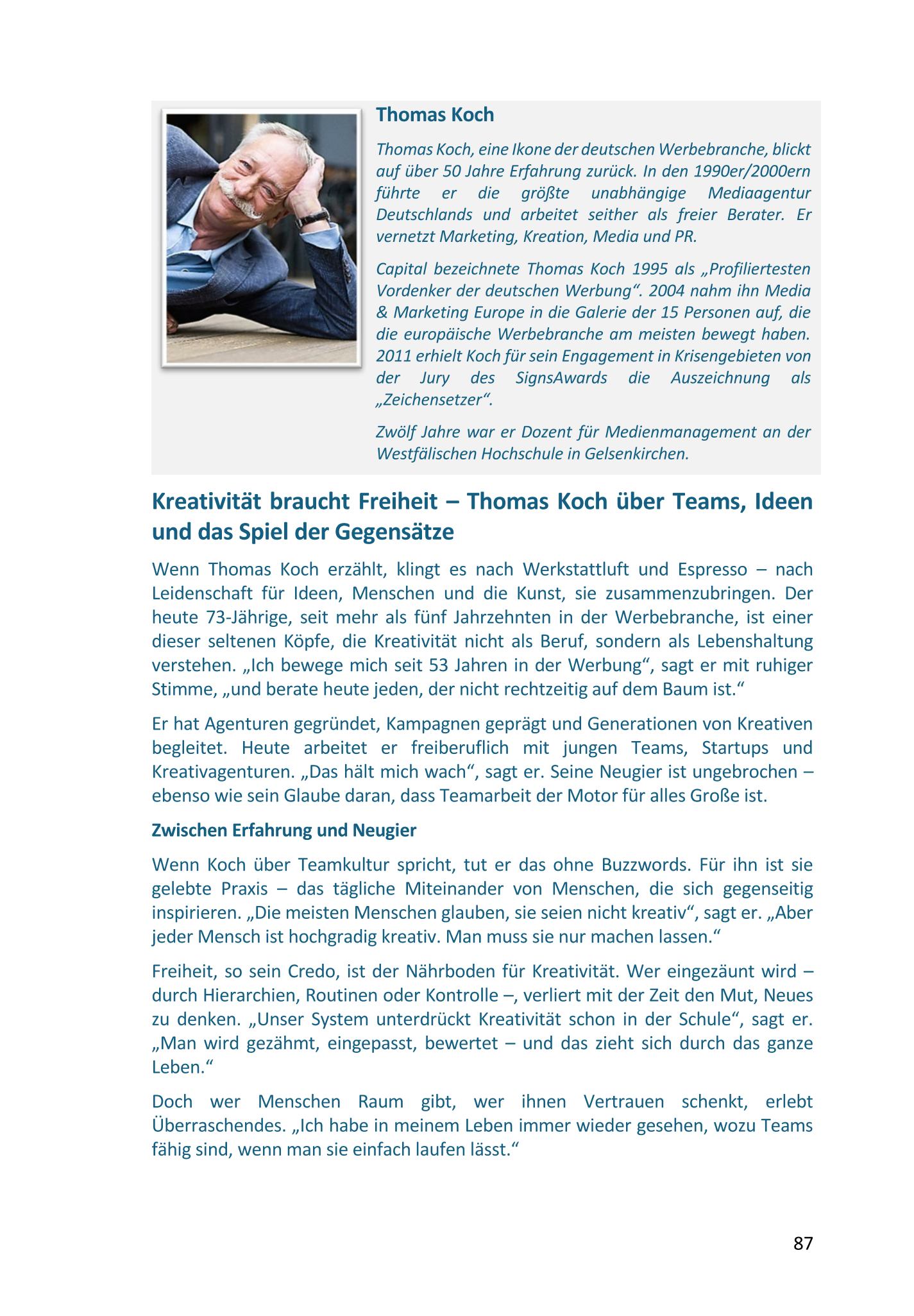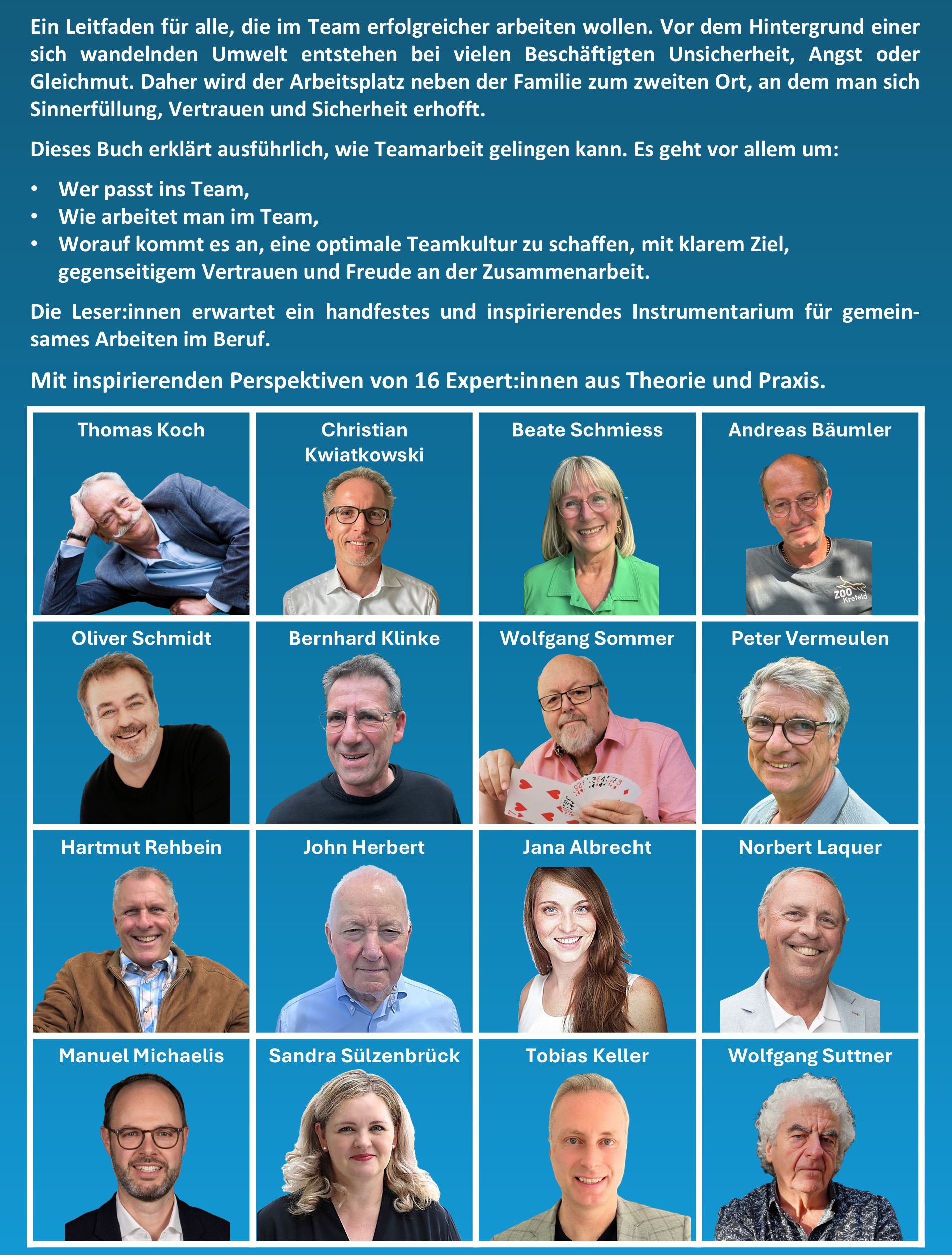 Die Nähe zur Praxis war uns von Anfang an besonders wichtig. Denn Teamarbeit entfaltet ihre Wirkung dort, wo Menschen täglich gemeinsam Verantwortung übernehmen. Deshalb haben wir erfahrene und nachweislich erfolgreiche Persönlichkeiten aus Wirtschaft, Kultur und unterschiedlichen Organisationen einbezogen, die Teamarbeit über Jahre hinweg gelebt und gestaltet haben.